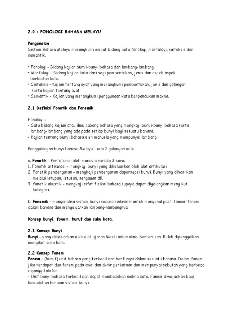 Terdapat dua bentuk fonem iaitu fonem. 23 Struktur Suku Kata Bahasa Melayu 24 Sistem Ejaan Rumi Bahasa Melayu 25 Tanda Baca 21 Definisi Fonetik Fonologi dan Fonemik Bidang Keterangan Contoh Fonetik Kaji cara bunyi-bunyi bahasa dihasilkan atau dilafazkan Terbahagi kepada 3. BAB Muka Surat I Pendahuluan Pengenalan 1 II Dapatan Kajian 21 Fonem Vokal bahasa Melayu 2-6 22 Bunyi Konsonan dalam bahasa Melayu 6-13 23 Konsonan Pinjaman 14-16 24 Pola Keselarasan Vokal 17-18 III Kesimpulan 19 BIBLIOGRAFI LAMPIRAN.